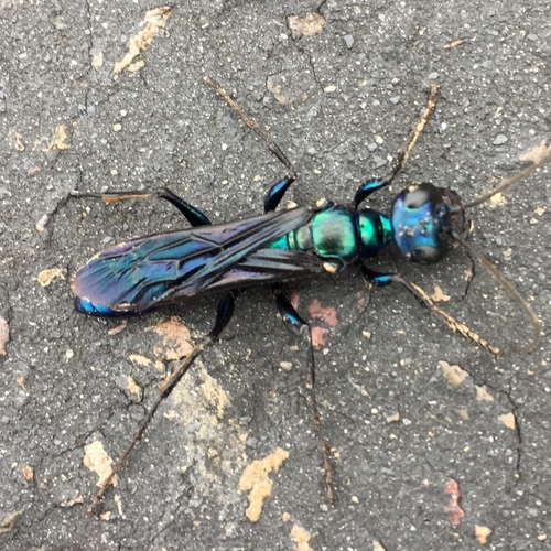Someone sent a picture of a steel blue cricket hunter. This is a good guy wasp that will feed on crickets by taking them back to their burrow, laying eggs. When the eggs hatch, the larvae feed on the paralyzed cricket. They are nonaggressive.