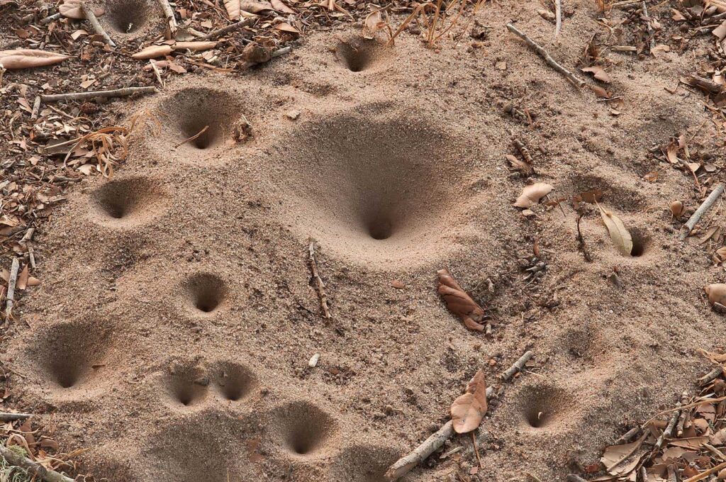 There are several insects that burrow holes into the ground. One is the ant lion, also called the doodlebug. This insect digs a hole with the dirt sloping down into the hole. An insect not watching what it is doing falls down into the hole to be grabbed by the ant lion for its dinner. These are good holes to have around your garden. Their favorite food is ants.