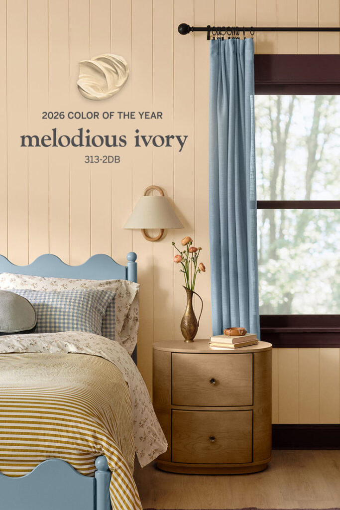 The color featured in the image is Melodious Ivory (shade 313-2DB), which was announced by Dutch Boy Paints as their 2026 Color of the Year. It is a soft, creamy neutral with warm undertones designed to bring a timeless and inviting feel to any space.